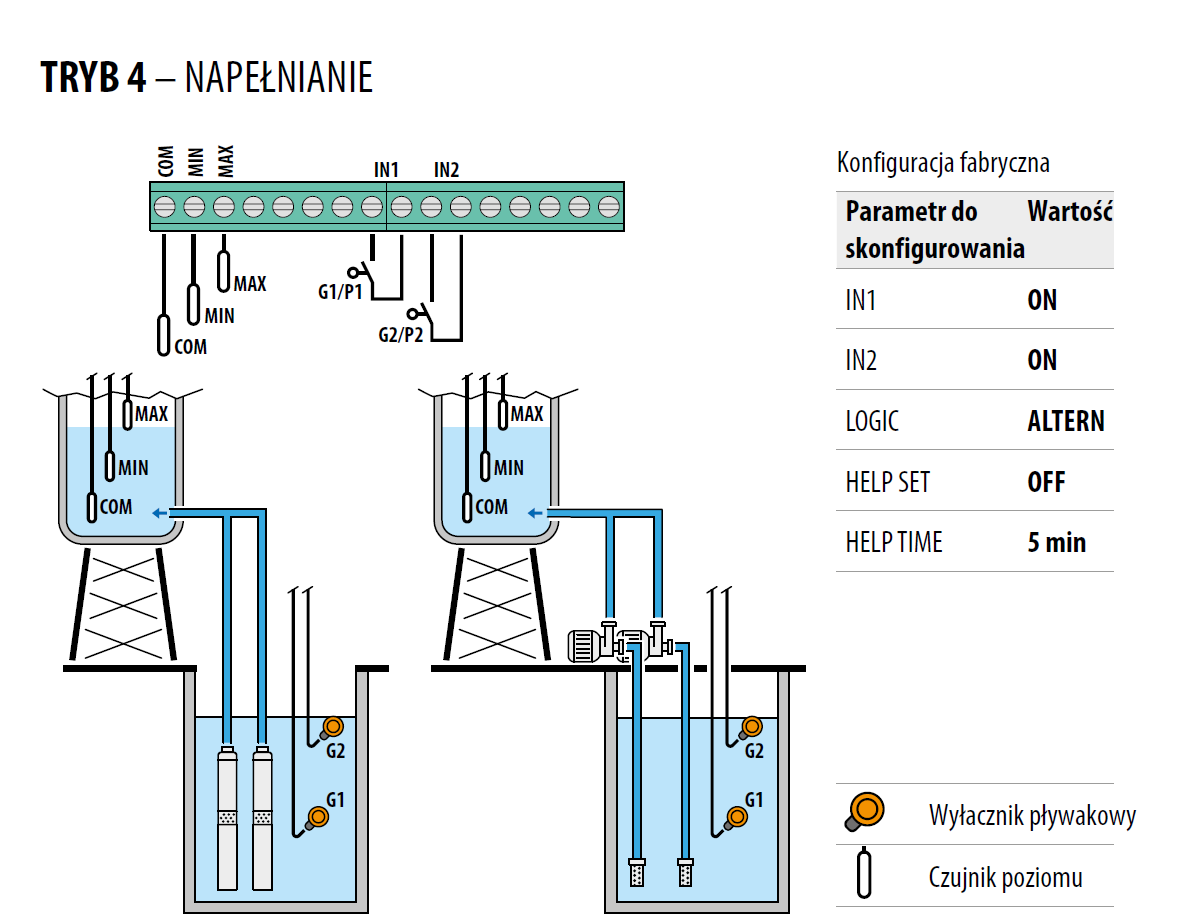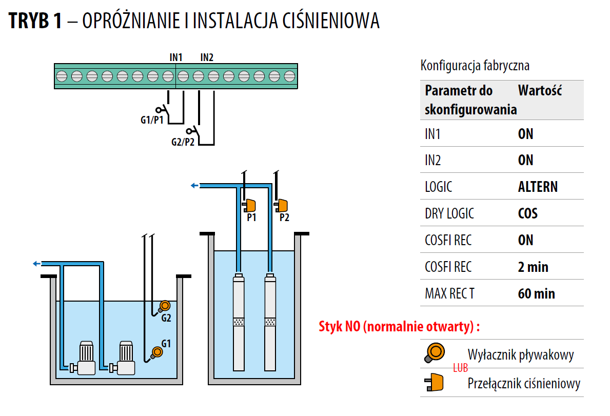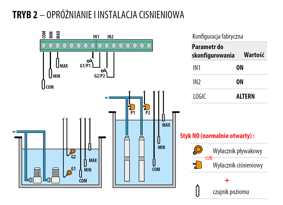 E1/E2 może sterować i chronić pracującą pompę za pomocą kilku wejść/ustawień: