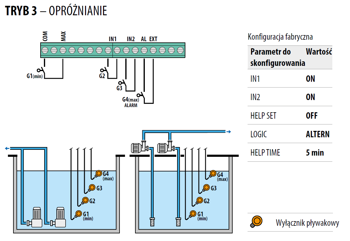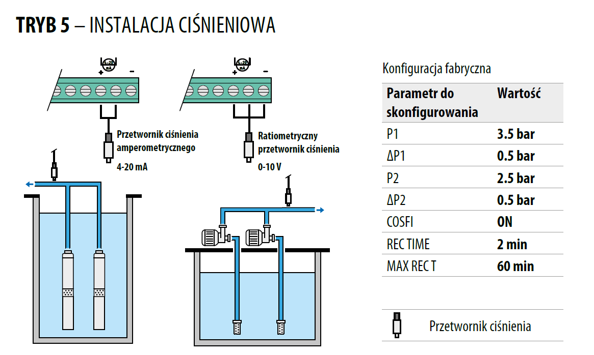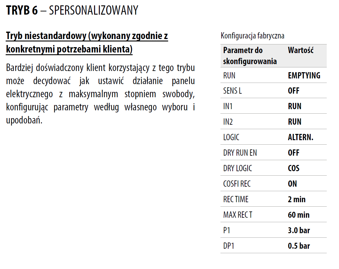 W przypadku awarii jednej z elektropomp, logika działania automatycznie wyklucza tę konkretną elektropompę z systemu, automatycznie umieszczając w jej miejsce drugą działającą pompę.