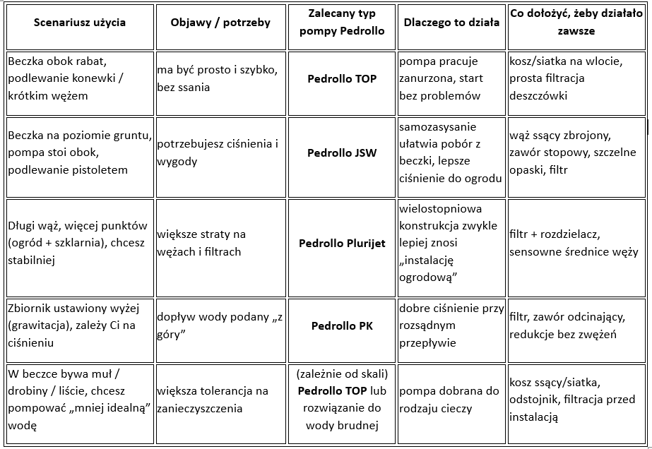 Tabela: jaka pompa Pedrollo do jakiego scenariusza z beczką?