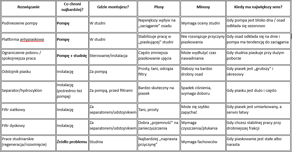 - Rozwiązania w studni (montaż pompy wyżej, platforma antypiaskowa, ograniczenie poboru, prace studniarskie) — realnie chronią pompę.