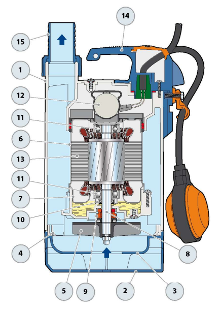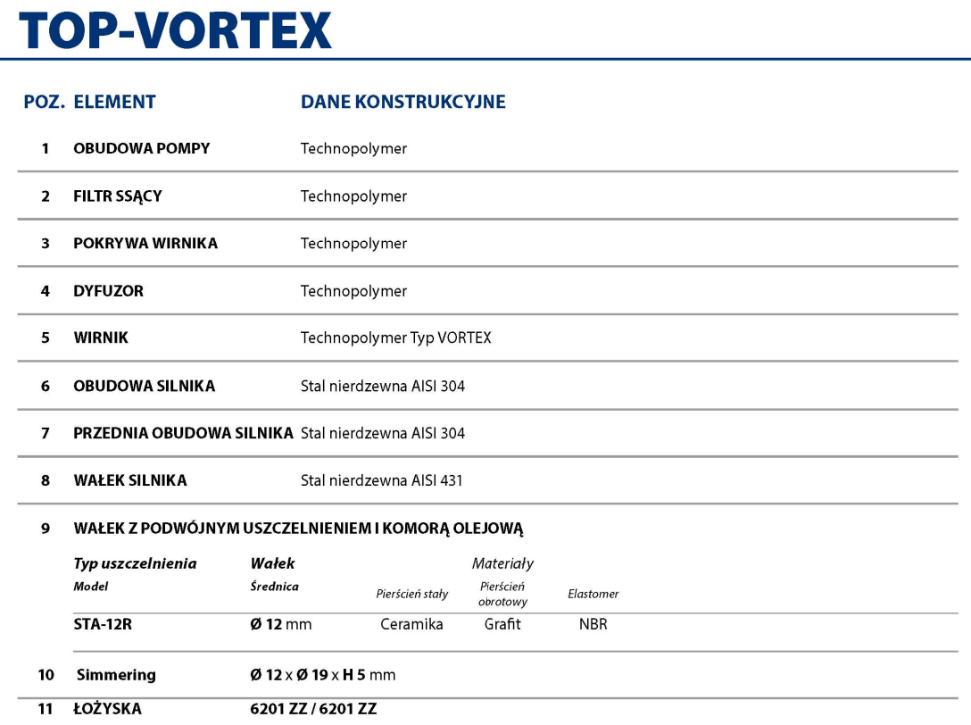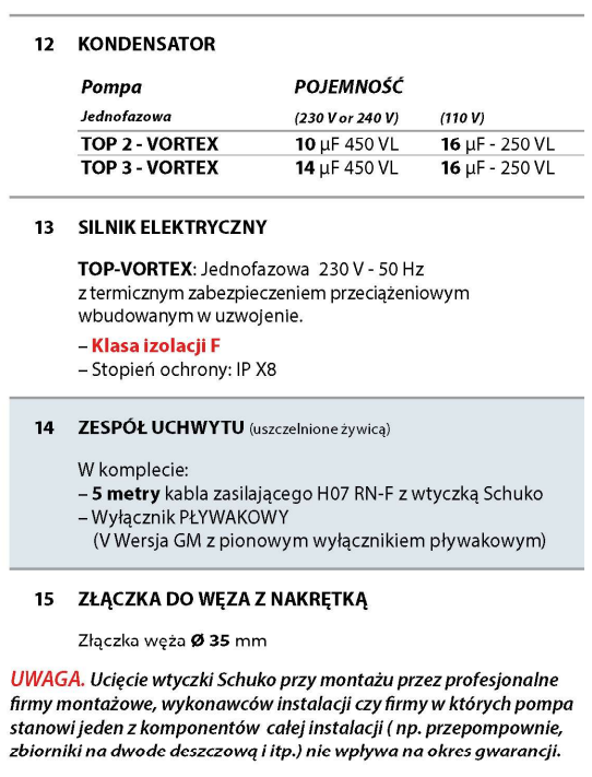 Pompa TOP-VORTEX nadaje się do stosowania do wody brudnej, która nie jest chemicznie agresywna w stosunku do materiałów, z których wykonana jest pompa.