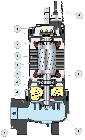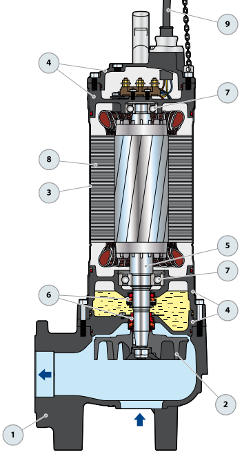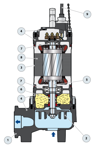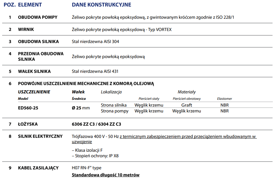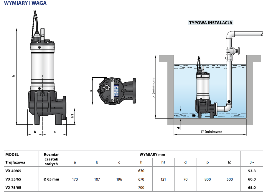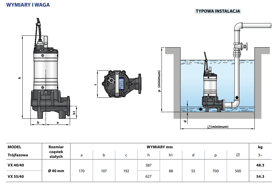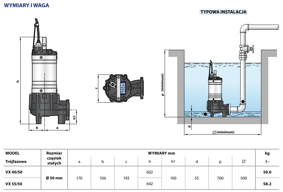 VX 40, VX 50 and VX 65 seria pomp, wykonana ze stali nierdzewnej i żeliwa, odpornego na długotrwałe ścieranie, jest wyposażona w wirnik VORTEX i jest przeznaczona do odprowadzania wody brudnej, ścieków oraz wody zmieszanej ze błotem. Nadają się do instalacji w kanałach ściekowych, tunelach, wykopach, kanałach, podziemnych parkingach itp.